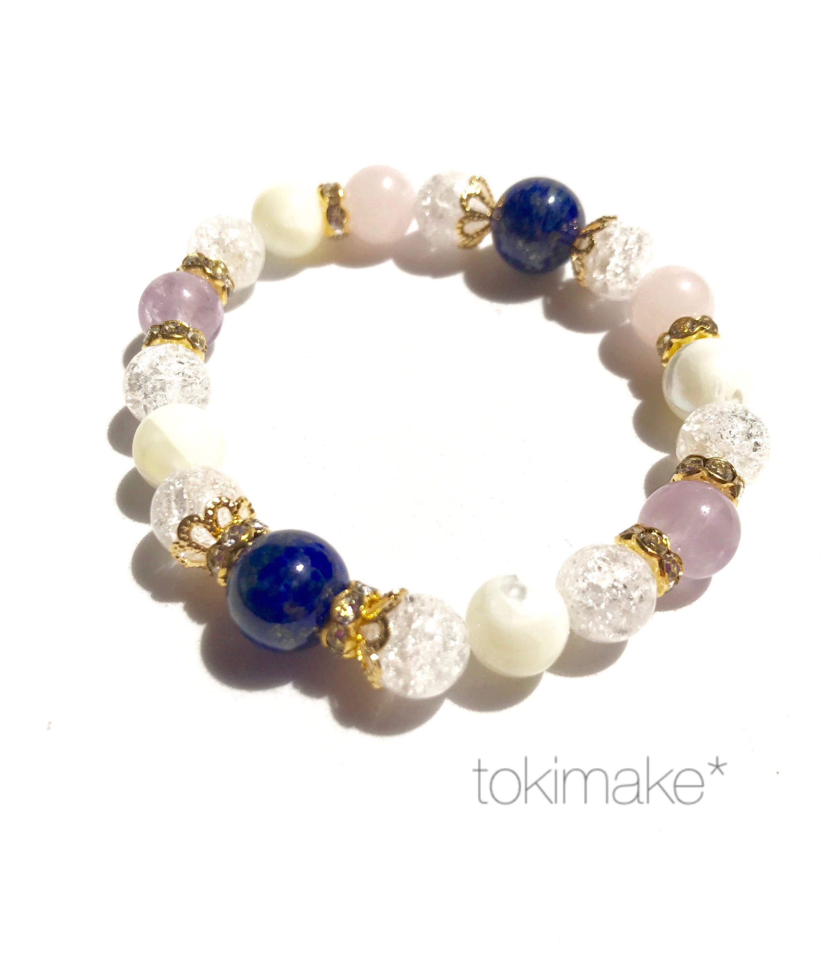 パステルカラーに星空のようなラピスラズリがアクセントになったブレスレットです☆