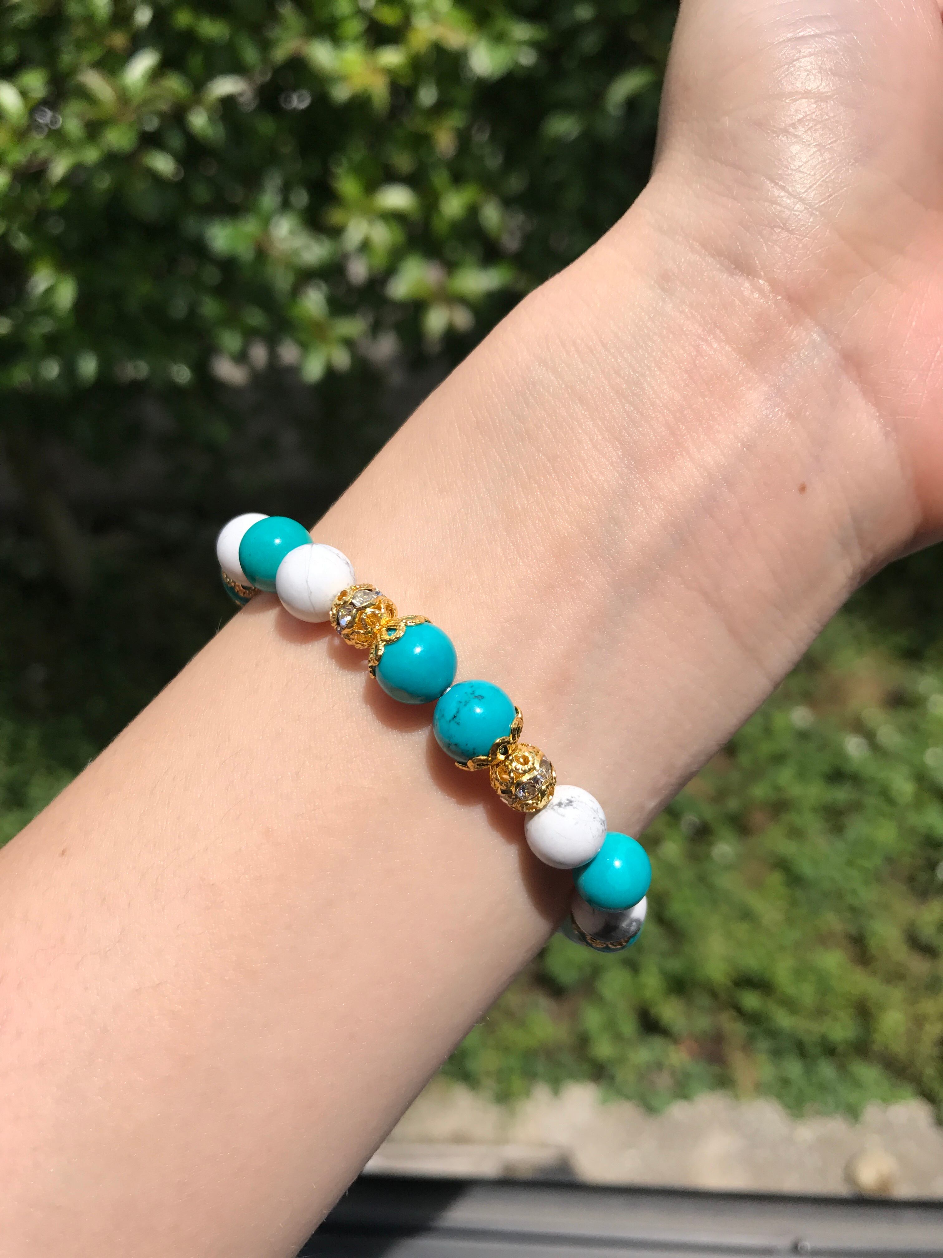 ターコイズブルーとハウライト、ホワイトオニキスの白が対照的でこれからの夏にも合うブレスレットを作りました☆