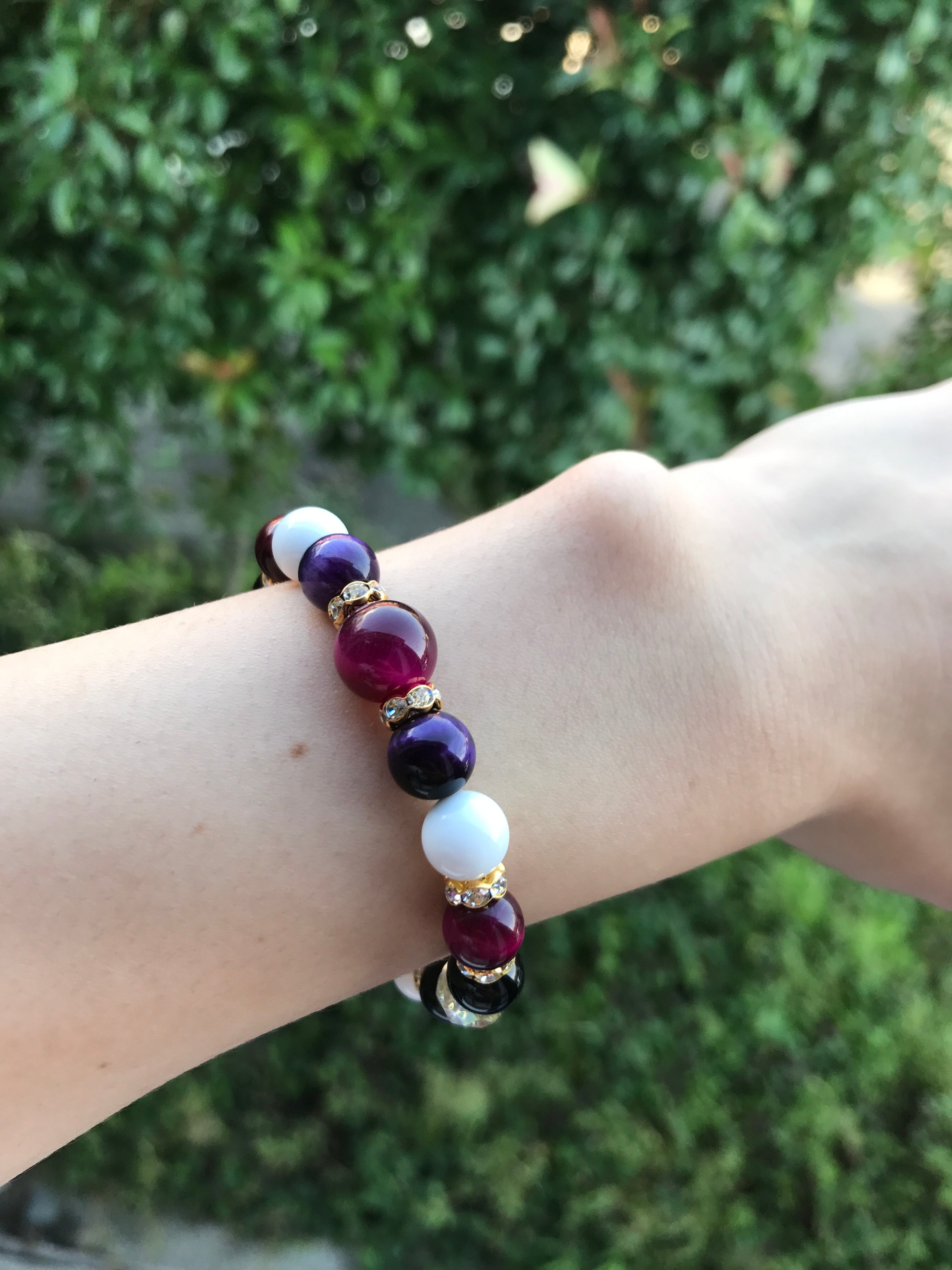 ピンクタイガーアイとパープルタイガーアイを主に使用し、キラキラが魅力的の存在感ばっちりのブレスレットです☆