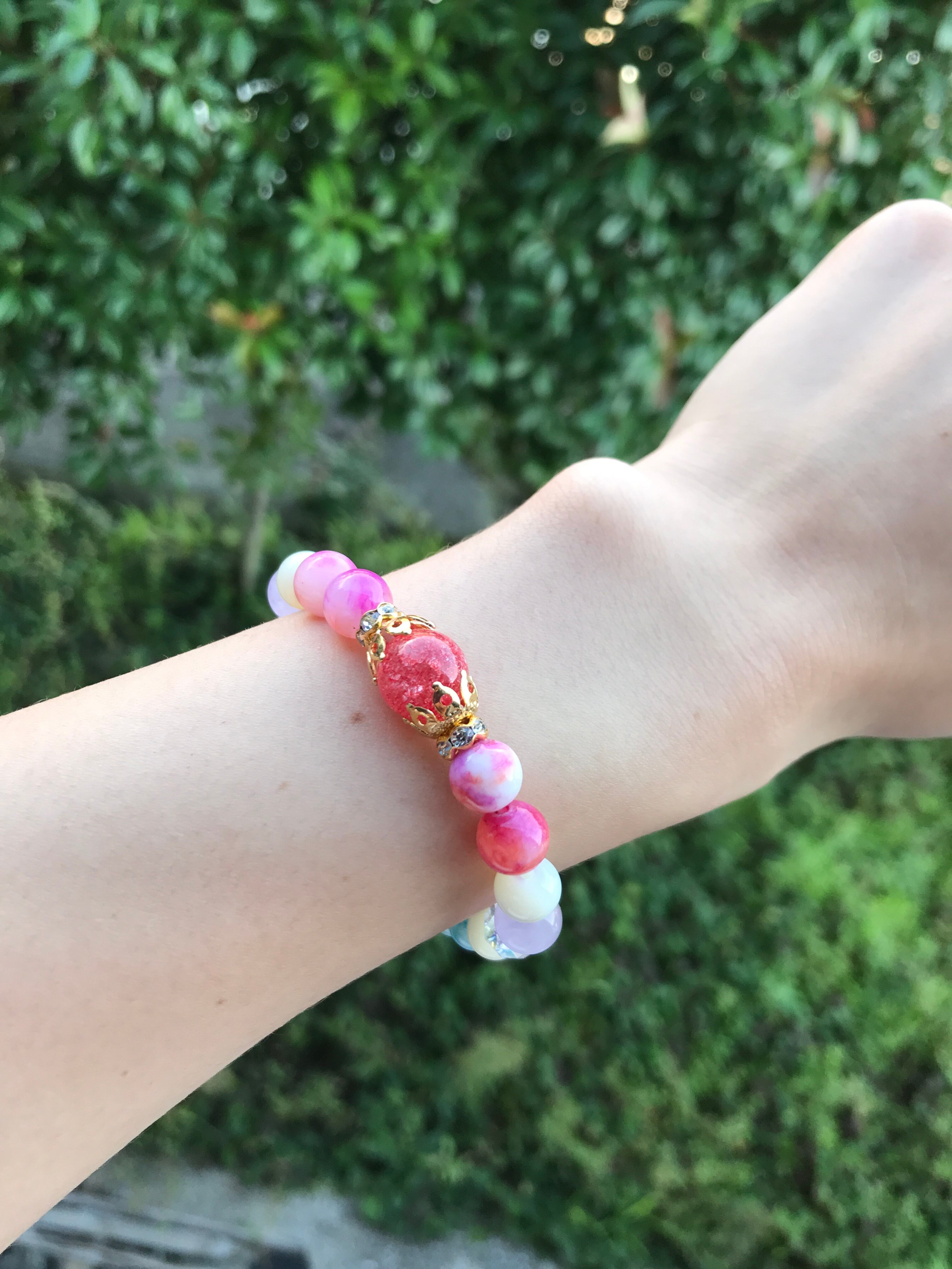 夏らしくマーメイドをイメージして作りました☆ ピンク、水色のキャンディジェイドのマーブル模様と、クラッククォーツ、コスモオーラがキラキラで魅力的です!