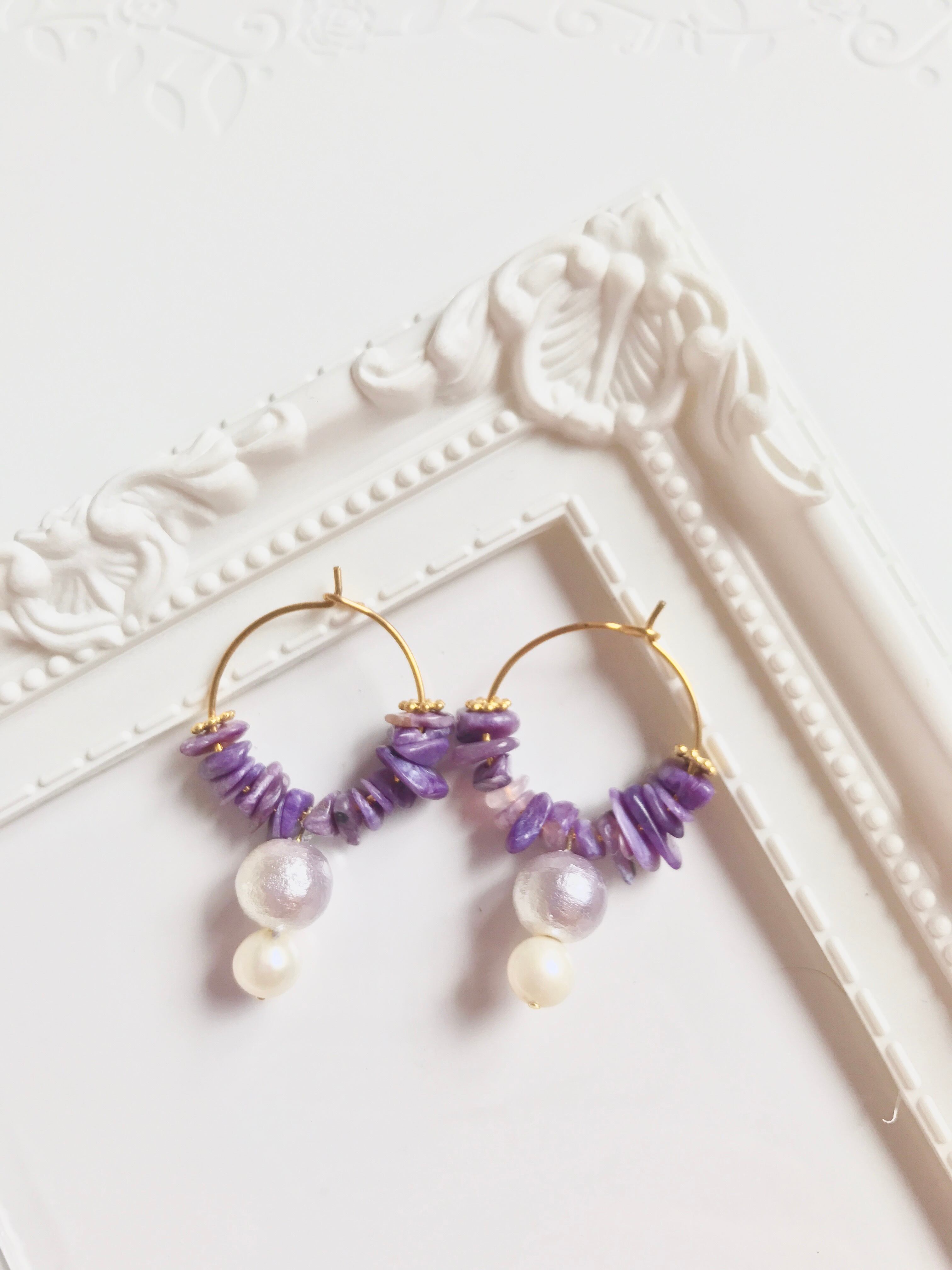 世界三大ヒーリング天然石の一つとされるチャロアイトとコットンパール、淡水パールでフープピアスを作成しました☆