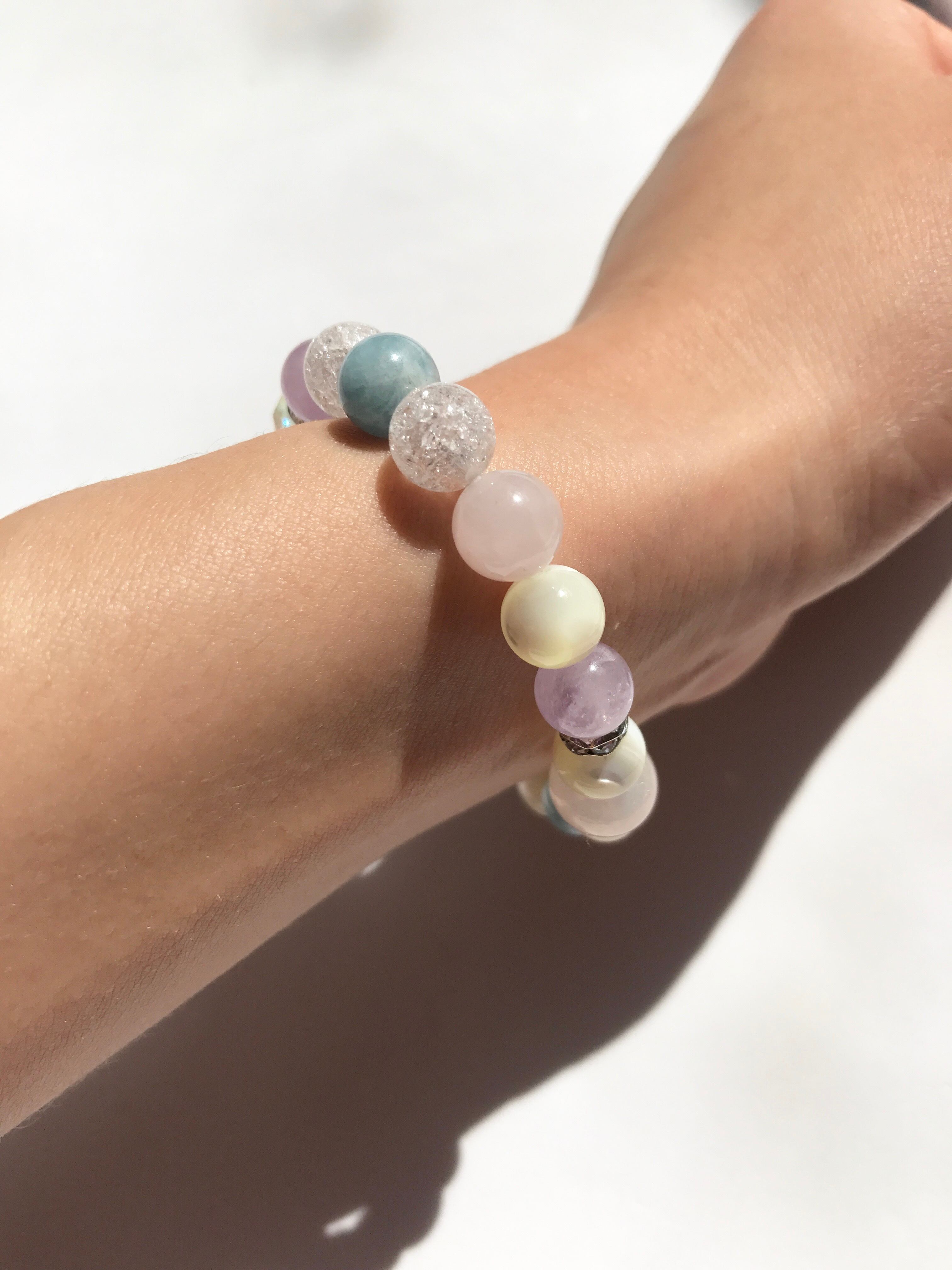 マザーオブパール、アクアマリン、ラベンダーアメジスト、ローズクォーツのメジャーな天然石でパステル、クラッククォーツとコスモオーラでキラキラ感をプラスしたパワーストーンブレスレットです☆