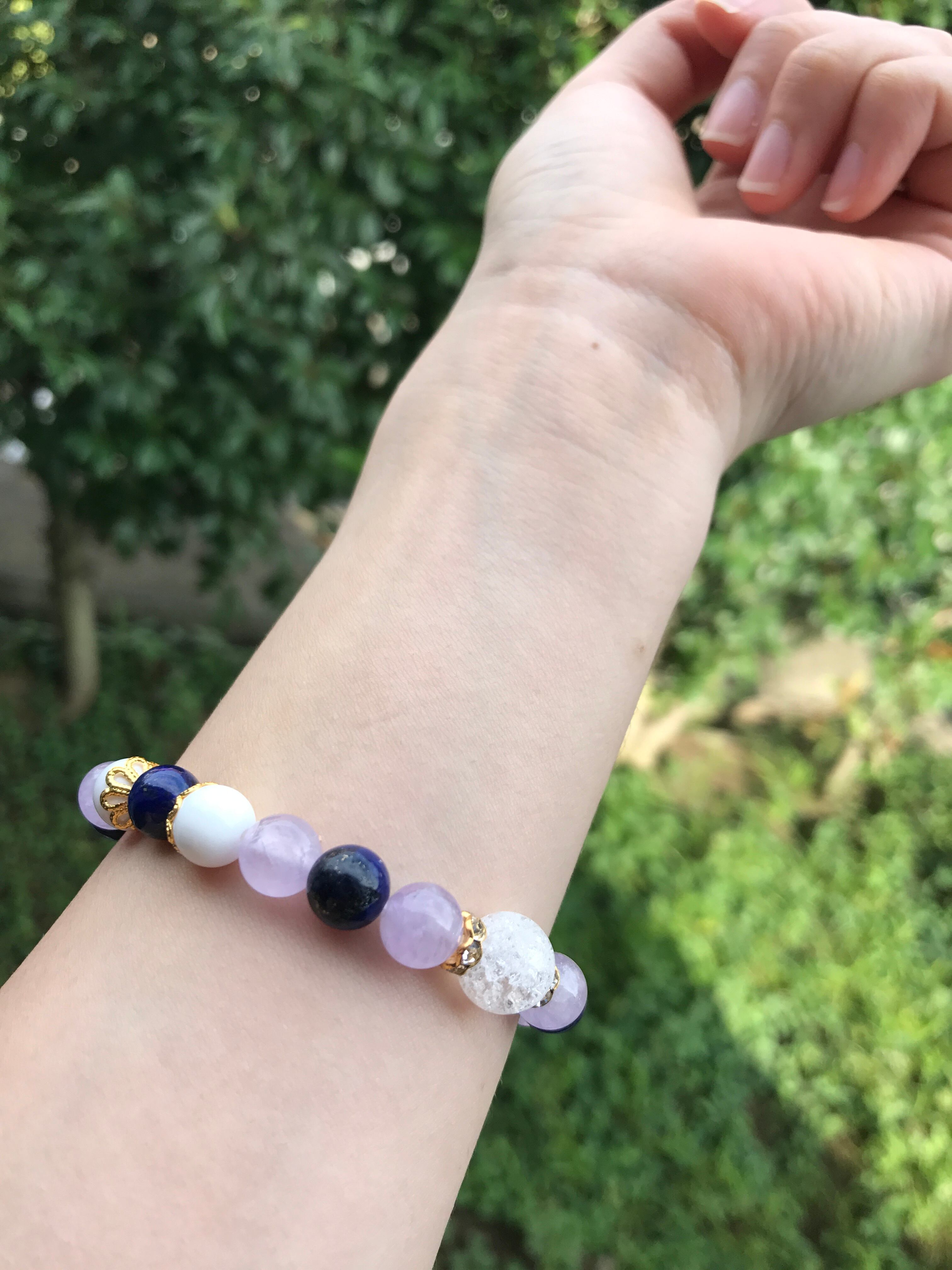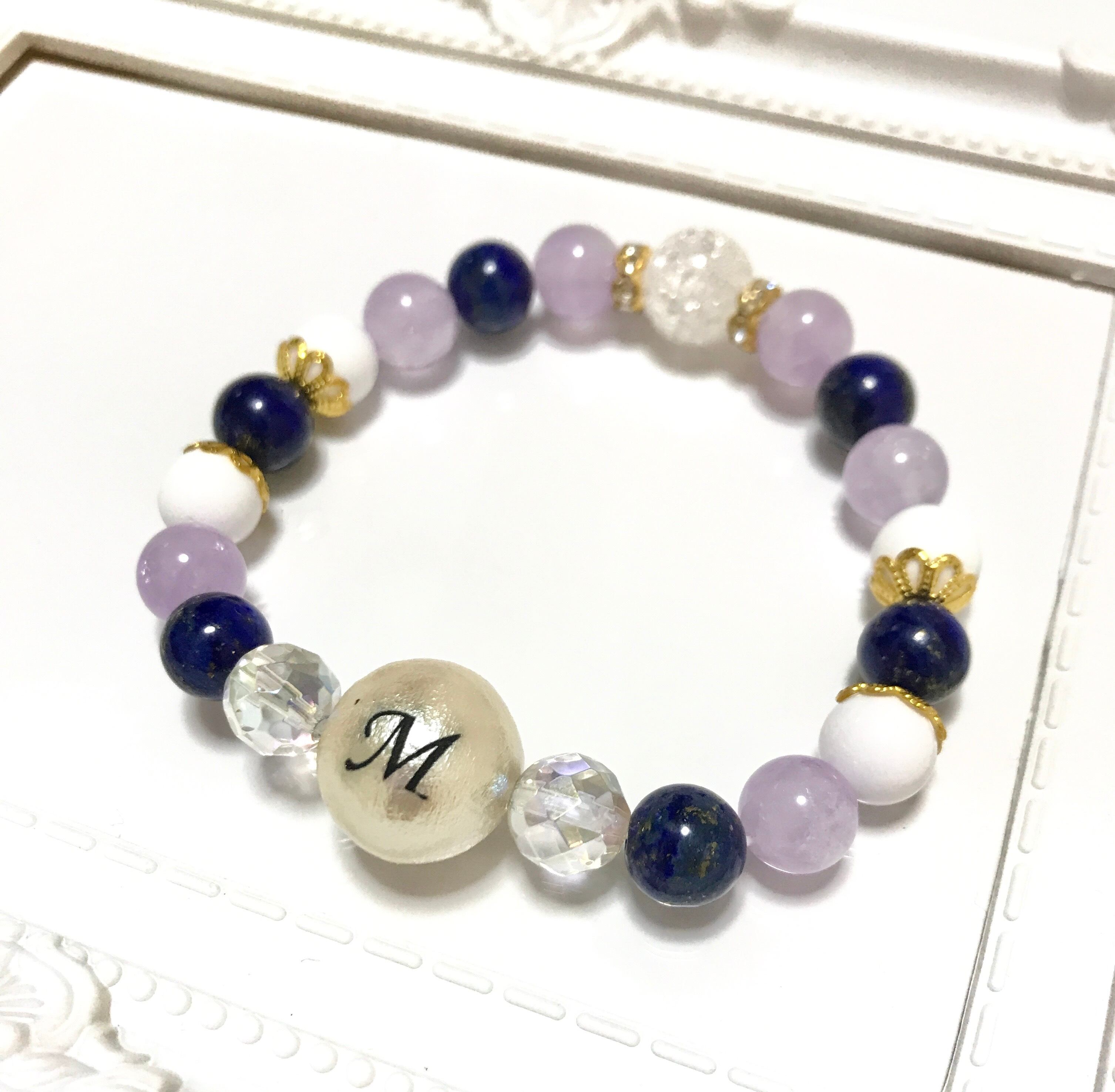 イニシャルコットンパールがアクセントになったパワーストーンブレスレットです☆ ラピスラズリの星空のような石とラベンダーアメジストで落ち着いた色合いにキラキラをプラスした上品にかわいく仕上げました。