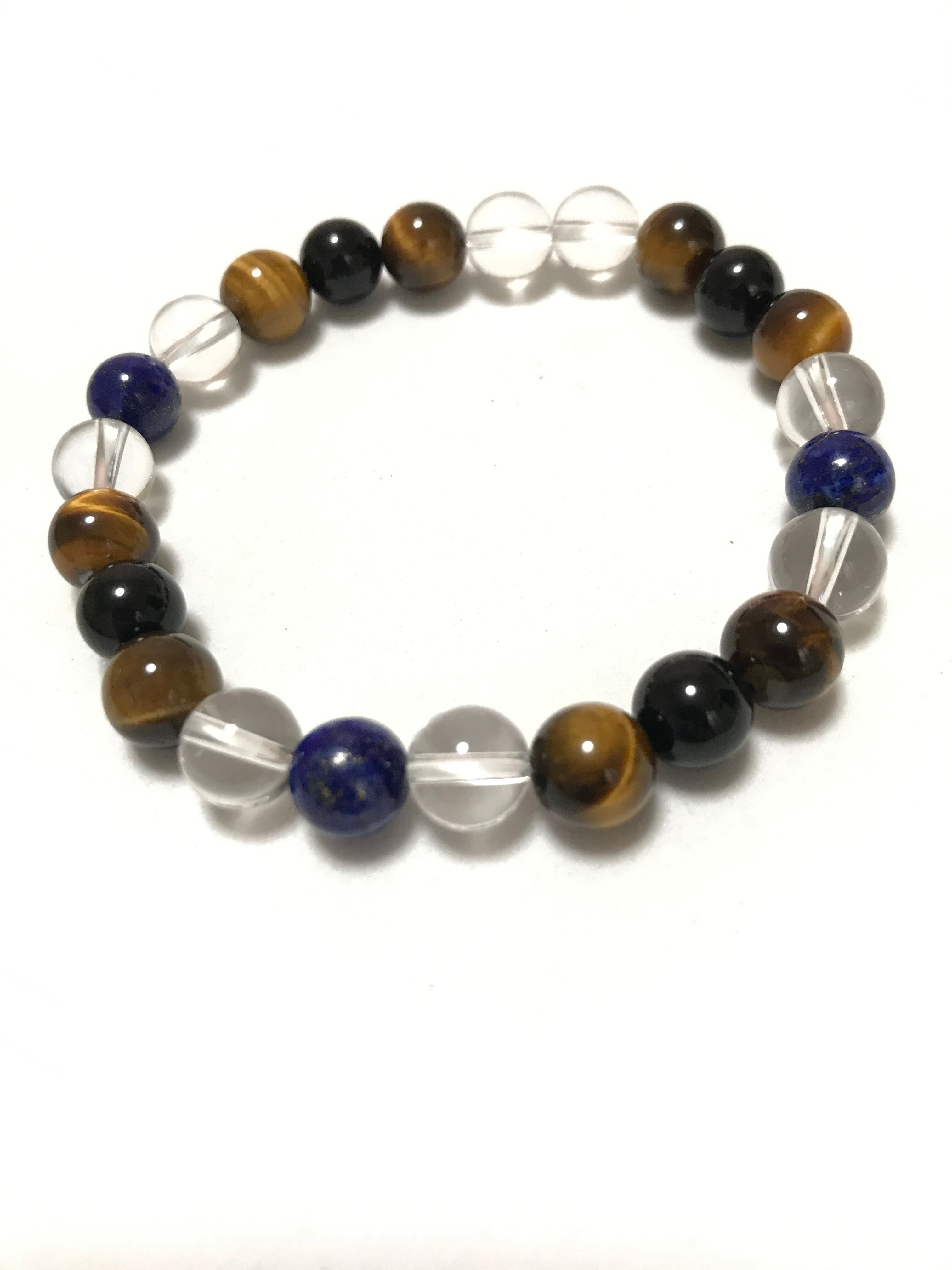 男性に特に人気があり、仕事運や金運を高めるとされているタイガーアイと、成功の象徴、漆黒の石オニキス、幸運の象徴とされているラピスラズリに無色透明の水晶をプラスした、おしゃれな男性向けのパワーストーンブレスレットです☆